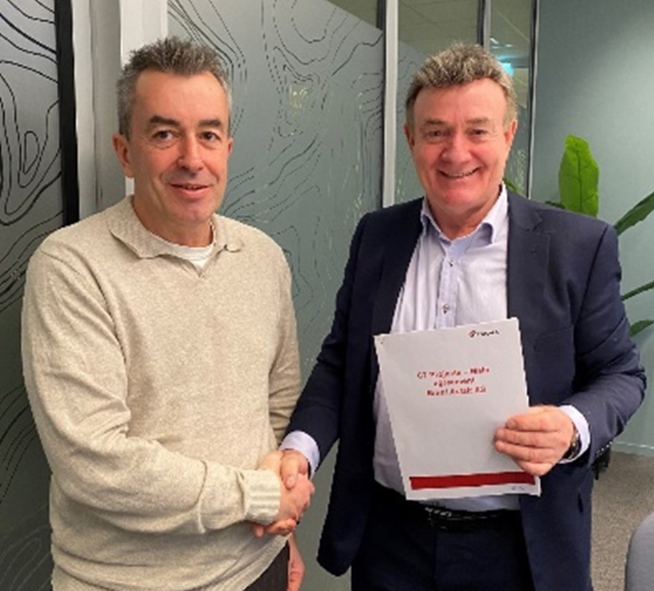 Undertecknande av avtal. Rune Dragsnes (till vänster), general manager Triona Norway AS och Ole Storevik (till höger), general manager Brani Asfal AS.